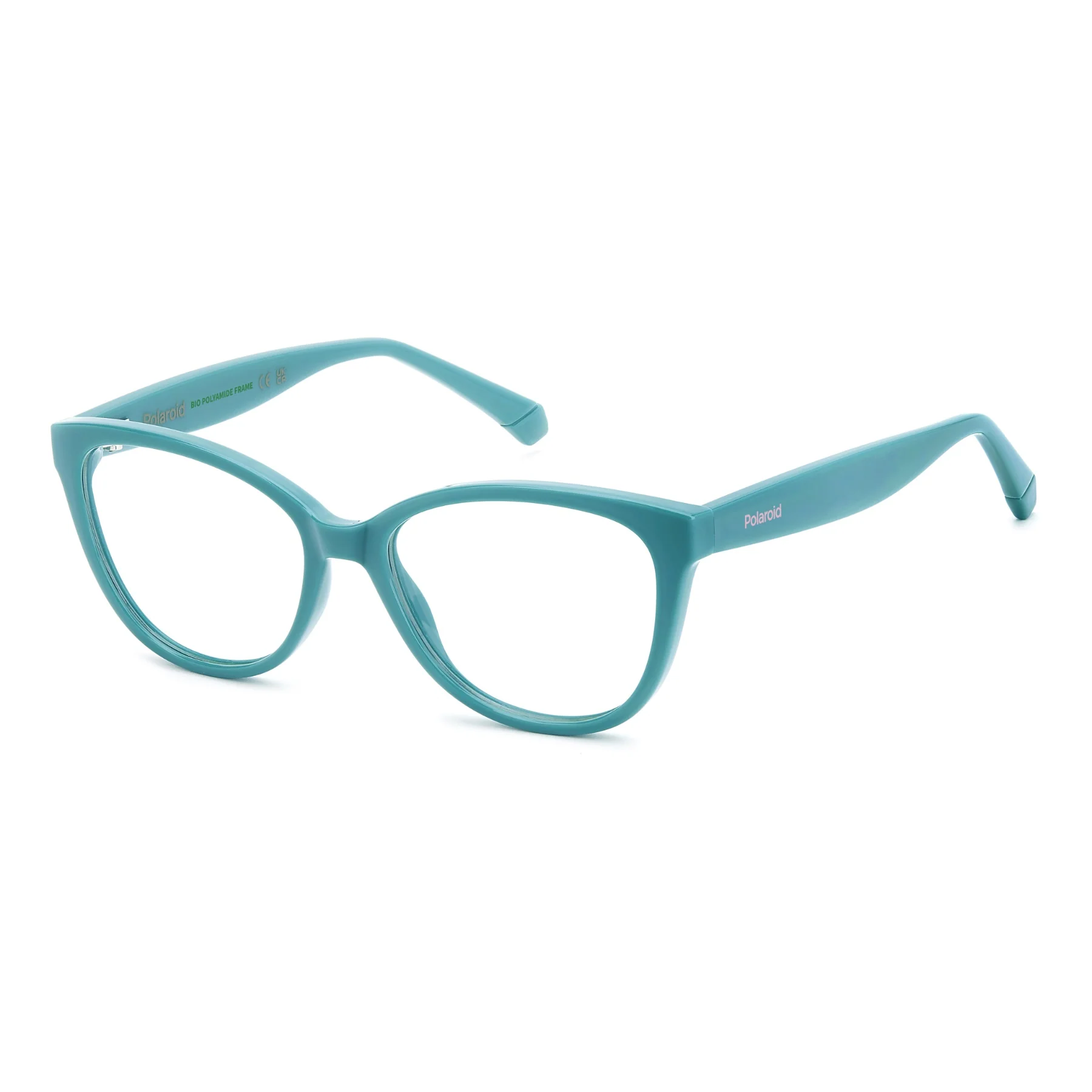 Polaroid eyeglasses for girls from 4 to 6 years old. Playful and irresistible thanks to the cat-eye frames, their design is fresh and linear. They’re perfect on every occasion and made to be worn with pleasure today and tomorrow. Another reason to choose them? They’re made from eco-polyamide, a long-lasting and durable material that’s kind to the environment. The colour palette is vibrant and playful, and the Polaroid logo is printed on the temples.
